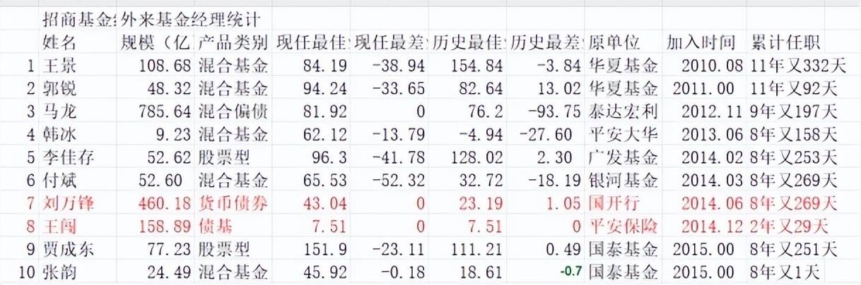 统计显示,招商基金42位外来基金经理中,在管规模前10的基金经理中,8人在管货币或债基,只有2人在管混合基金。