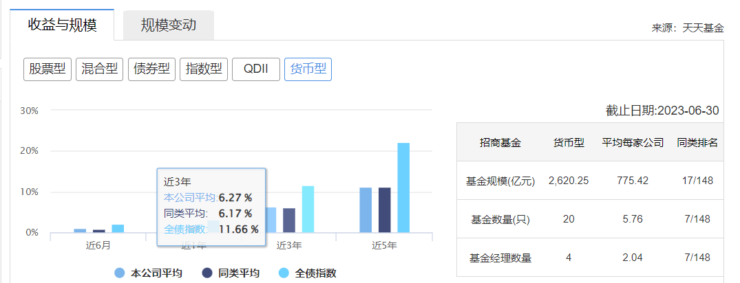 天天基金网数据显示,截至10月19日,招商基金货币基金近3年平均收益6.27%,同类平均6.17%,跑赢同行0.1%。