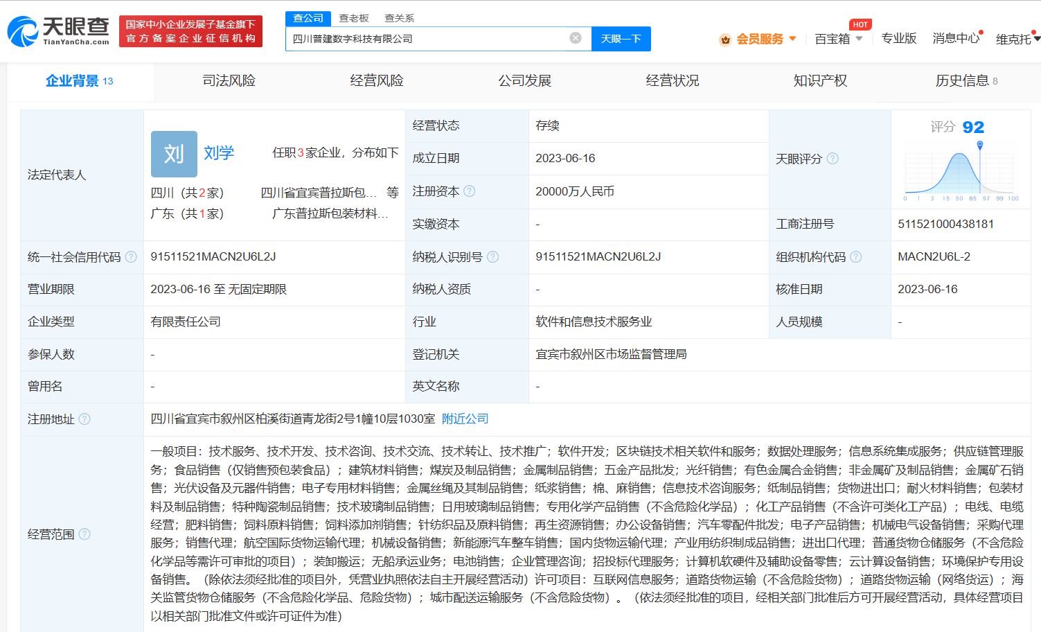 天眼查App显示,近日,四川普建数字科技有限公司成立,法定代表人为刘学,注册资本2亿人民币,经营范围包括区块链技术相关软件和服务、数据处理服务、信息系统集成服务、供应链管理服务、食品销售、建筑材料销售、光伏设备及元器件销售等。股权全景穿透图显示,该公司由四川省宜宾五粮液集团有限公司旗下3家公司四川省宜宾普什集团有限公司、四川省宜宾五粮液集团进出口有限公司、四川安吉物流集团有限公司,以及四川华西集采电子商务有限公司共同持股。