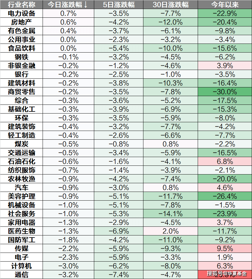 行业上来看,仅电力设备、房地产、有色金属板块上涨,通信、计算机、电子等板块下跌。