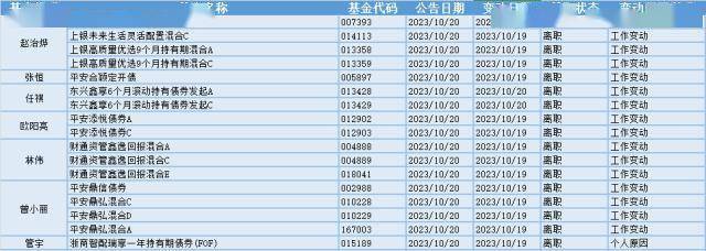 根据巨灵统计的数据显示,近30天(9.20-10.20)共有294只基金产品的基金经理发生离职变动。其中今天(10.20)有17只基金产品发布基金经理离职公告,从变动原因上来看,有6位基金经理是由于工作变动而从管理的16只基金产品中离职的,有1位基金经理是由于个人原因而从管理的1只基金产品中离职的。