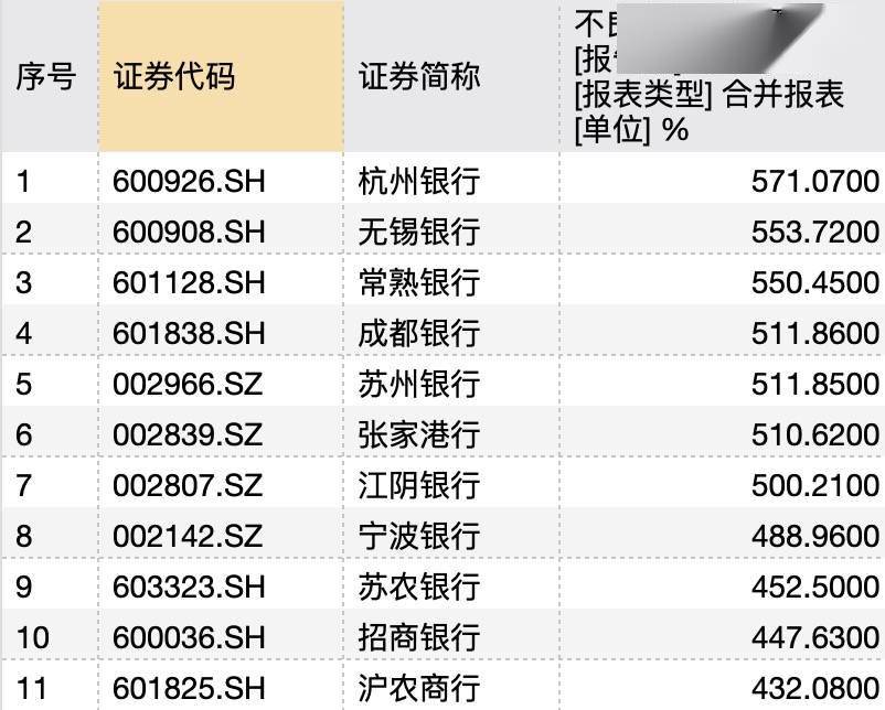 Wind数据显示,截至2023年6月末,A股上市银行中拨备覆盖率达到400%以上的有11家,其中杭州银行、无锡银行(600908.SH)、常熟银行(601128.SH)、成都银行(601838.SH)、苏州银行(002966.SZ)、张家港行(002839.SZ)、江阴银行(002807.SZ)拨备覆盖率均高于500%。