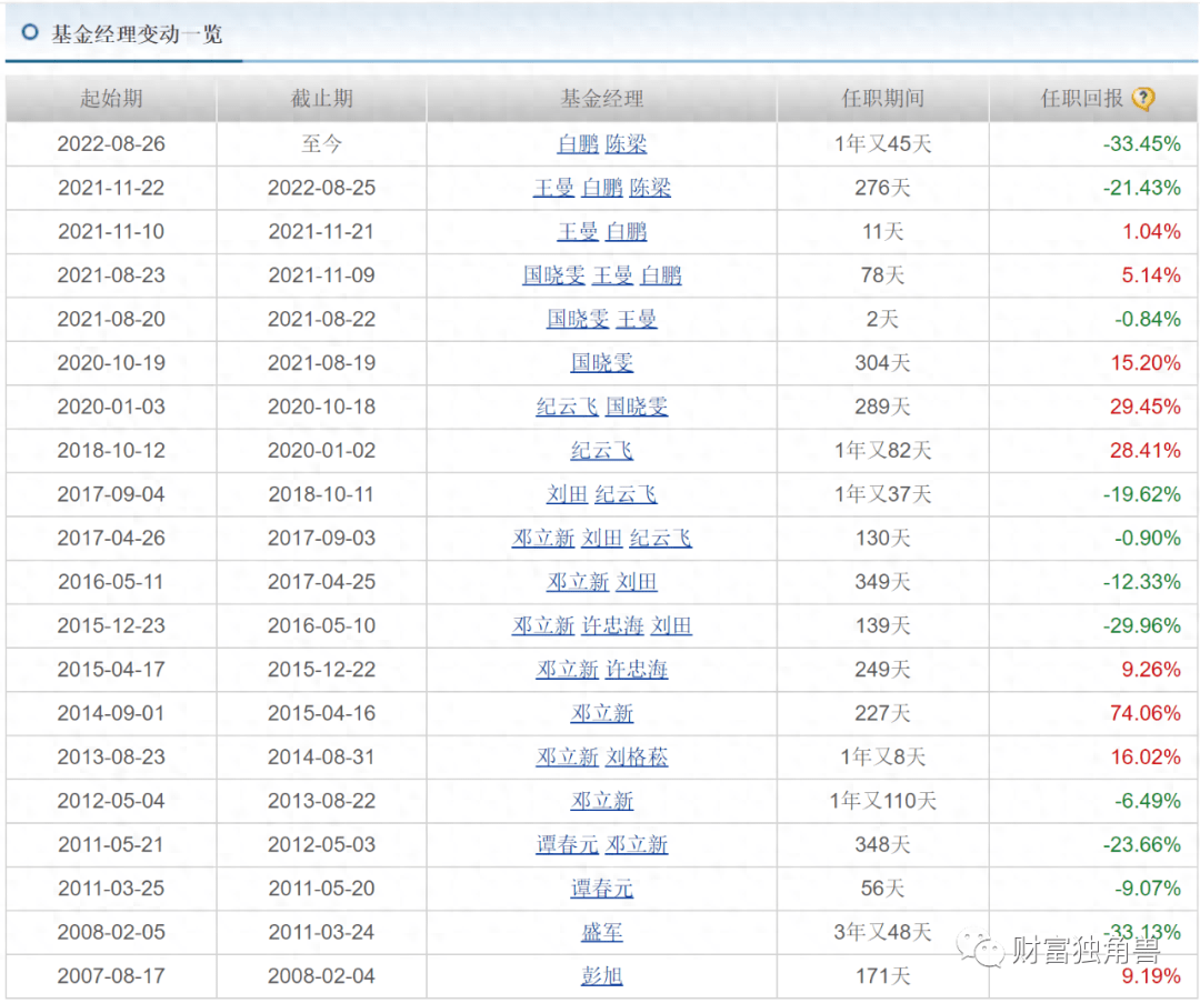 据天天基金网显示,在中邮核心成长混合基金经理变更一栏表看出,总共进行了20次调整,在每次调整中,邓立新的收益率最高达74.06%,但此后基金的收益率就出现下降,2015年12月23日到2018年10月11日,这4次的基金经理调整都是以负收益为主。此后又经历3个季度的正收益。但自2021年11月22日至今的两次基金经理调整,还是以负收益为主其分别为-21.41%、-33.45%。