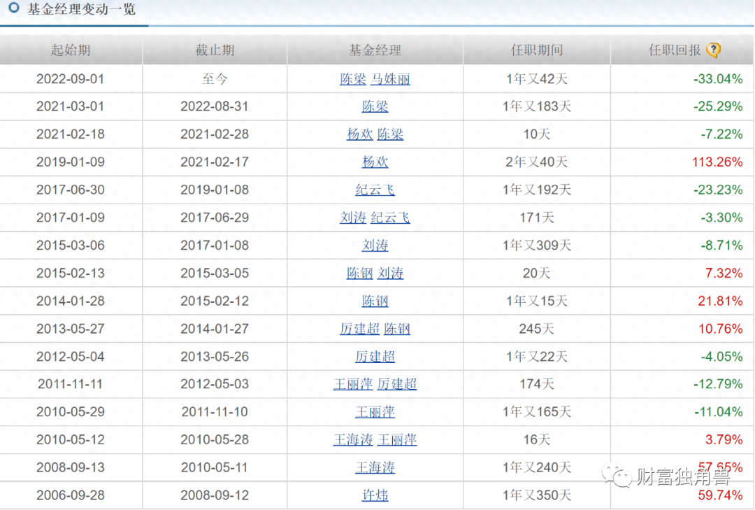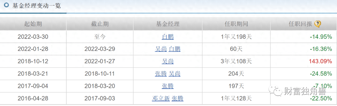 据天天基金网显示,2016年4月28日-2017年9月3日该基金由邓立新和张腾共同管理,在其管理的1年又128天里,任职回报-22.50%。该基金经历过6次基金经理变动,但6次调整中,只有一次是盈利的,吴尚管理的3年又108天里,任职回报143.09%。