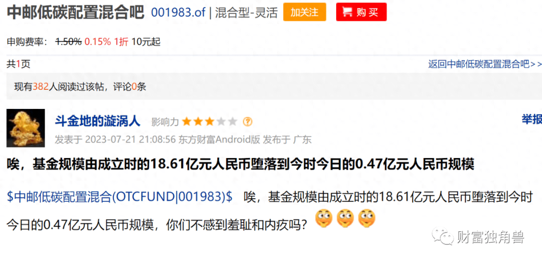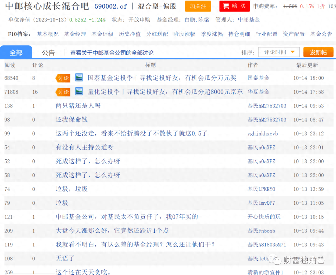 业绩亏损,该基金的各类贴吧下面充斥着基民的愤怒。有基民表示,我就看不明白,有这么差的基金经理?怎么还让他们干?要把基民的钱造光了才下岗吗?也有基民表示,相关职能部门好好查查,这些经理拿着高薪,不把基民当回事,无息资金就这样被他们瓜分完了。