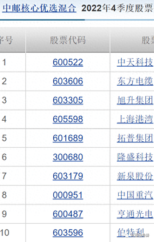 据中邮核心成长混合基金2022年4季报显示,旭升集团、中天科技、东方电缆为前三大重仓股,2022年四季度末,中邮核心成长混合股票持仓占基金总资产的比例为73.03%。前十大重仓股占基金资产净值的比例为36.85%,同类平均为45.1%。