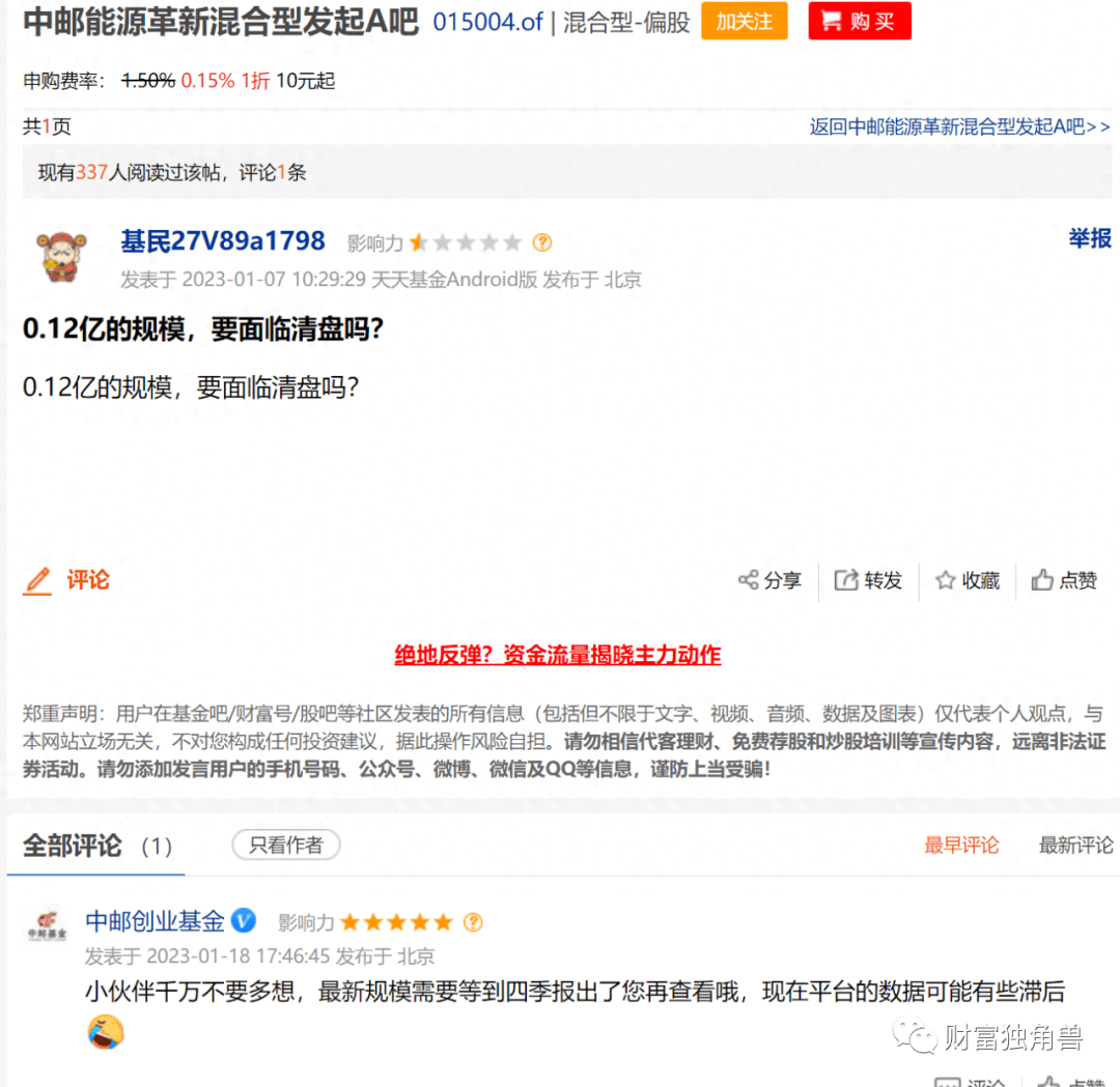 基金业绩持续亏损,有基民表示,0.12亿的规模,要面临清盘吗?而中邮创业基金小的客服回复,伙伴千万不要多想,最新规模需要等到四季报出了您再查看哦,现在平台的数据可能有些滞后。据天天基金网显示,截至2023年6月30日,中邮能源革新混合型发起A,期末净资产0.12亿元,比上期增加5.77%。