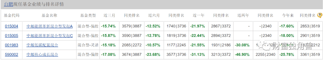 我们先分析一下白鹏旗下另外两只基金,中邮能源革新混合型发起基金和中邮低碳配置混合基金。据天天基金网显示,中邮低碳配置混合基金成立于2016年4月28日,基金经理为白鹏,截至今年2季度末基金规模0.47亿元。截至10月13日基金单位净0.9390。