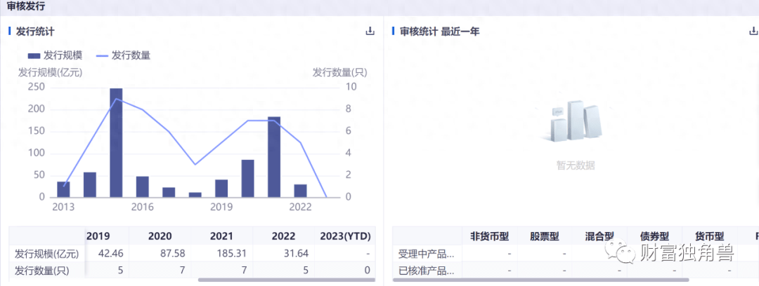 我们先回顾一下近年来中邮基金发行基金的规模和数量,据公开数据显示,近年来中邮基金发行数量并不多,2019年发行5只基金,发行规模42.46亿元;2020年发行7只基金,发行规模87.58亿元;2021年发行7只基金,发行规模达到185.31亿元;但2022年只发行5只基金,基金规模降至31.64亿元。