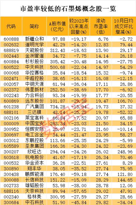 证券时报·数据宝统计,截至目前,滚动市盈率低于30倍的石墨烯概念股有30只。