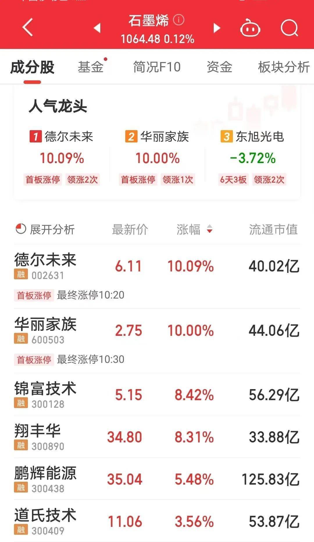 沉寂多时的石墨烯板块盘中爆发,多只概念股盘中急速拉升。其中锦富技术、翔丰华盘中均一度涨超15%,收盘时2股股价回落,最终分别收涨8.42%、8.31%。德尔未来、华丽家族涨停;鹏辉能源、道氏技术、玉龙股份、爱旭股份、新纶新材、中国宝安、远东股份等概念股涨幅也靠前。