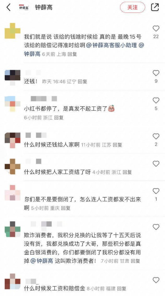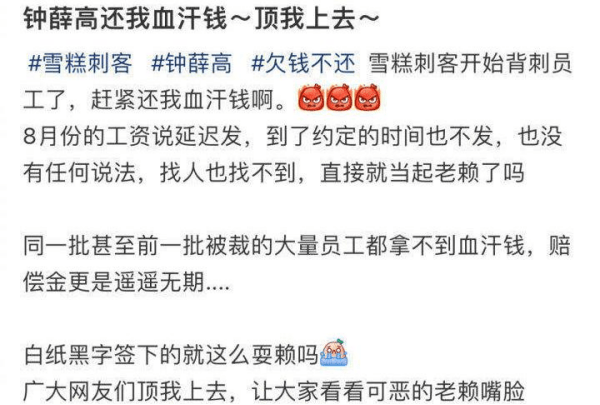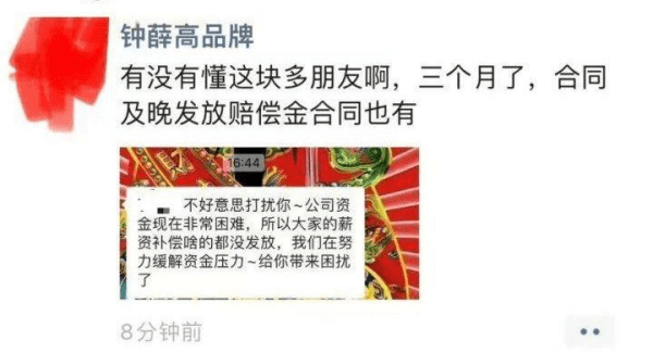 然而,有自称钟薛高客服部门“前员工”的网友透露,在公司效益不好期间,包括他在内的六名员工与公司人事提出补偿,并签署了离职同意单。按照约定,补偿金和工资应在10月15日发放,但当天公司并未履约。当该员工讨要说法时,“公司回复账户上没有钱补偿,说要等,没有具体的时间点。”