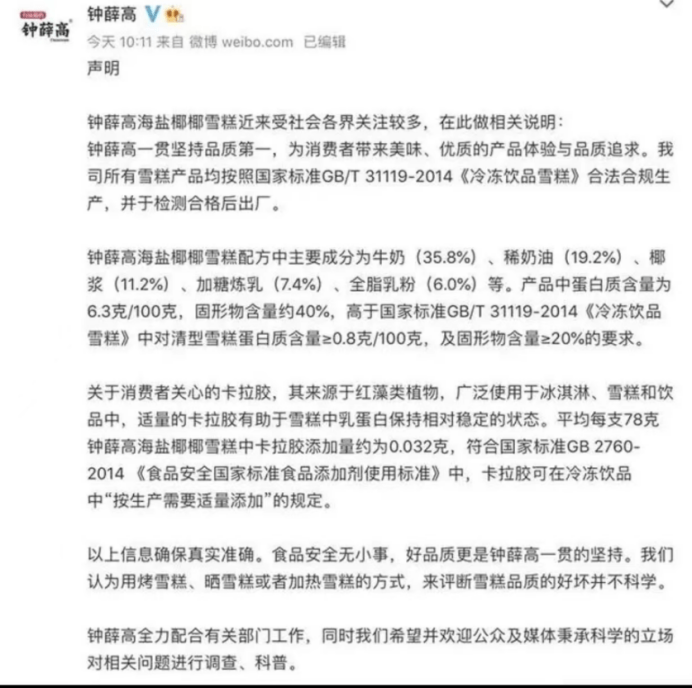 对于网友们的担忧,钟薛高迅速作出了回应。他们强调,他们的雪糕是合法合规生产并检测合格出厂的,产品的蛋白质含量还高于国家标准。此外,他们承认在雪糕中添加了卡拉胶等稳定剂,但这些物质的添加量是符合国家标准的,而且是为了让雪糕中的乳蛋白保持稳定状态。