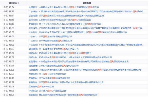 据观察者网不完全统计,仅10月19日晚间至20日一天时间内,就有包括牧原股份、中国建筑、中国铝业、国电电力、通用股份、宝钢股份、广济药业等多个行业头部在内的36家A股上市公司发布回购股份或股东增持的公告。