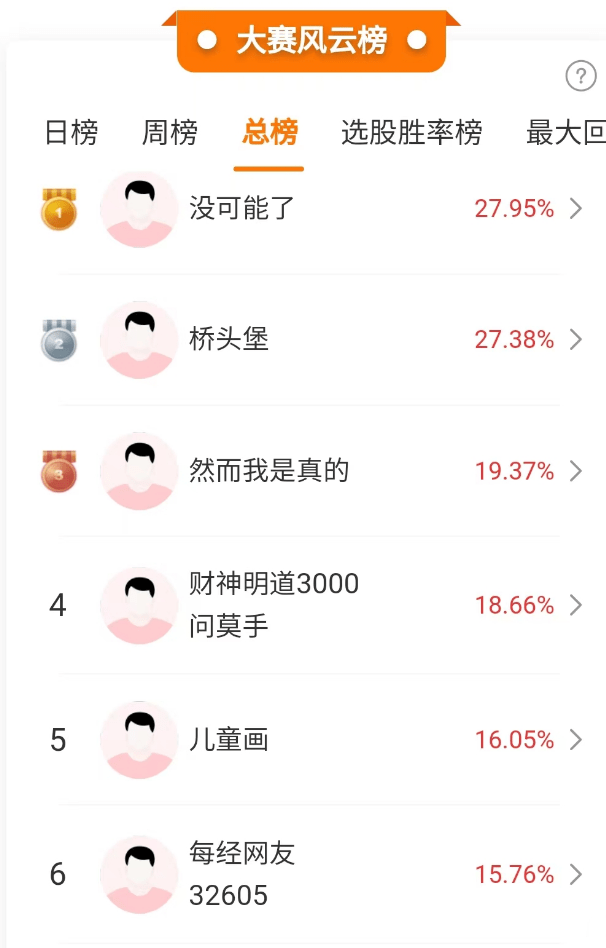 第一名选手“没可能了”和第二名选手“桥头堡”在昨日清仓华鲲振宇概念股后,就一直空仓,因此避开了市场的调整。