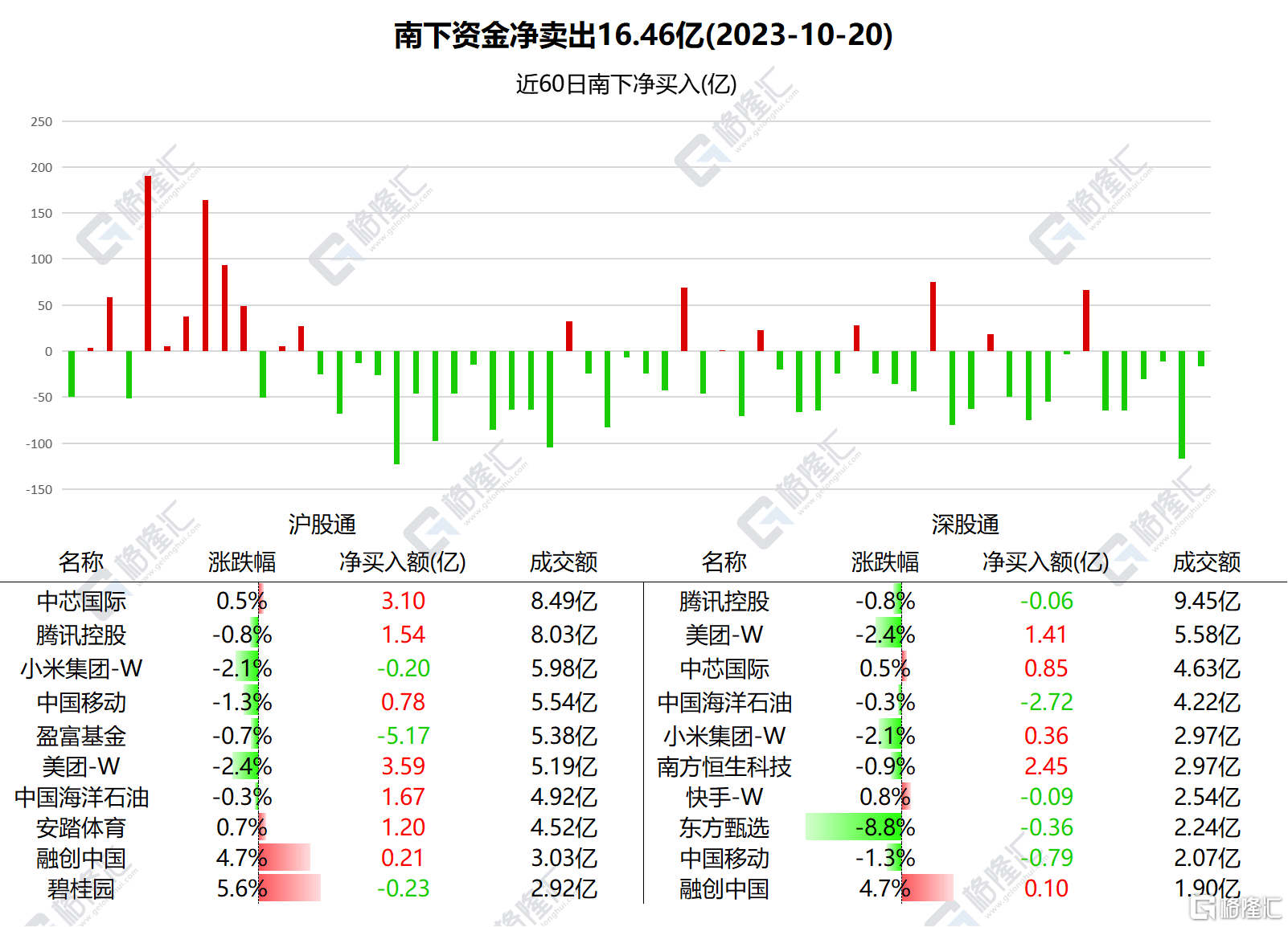 南下资金今日净买入港股18.68亿港元。港股通(沪)方面,美团-W、中芯国际分别获净买入3.59亿港元、3.1亿港元;盈富基金净卖出额居首,金额为5.17亿港元;港股通(深)方面,南方恒生科技、美团-W分别获净买入2.45亿港元、1.41亿港元;中国海洋石油净卖出额居首,金额为2.72亿港元。南下资金已连续15日加仓美团,共计65.42亿港元。