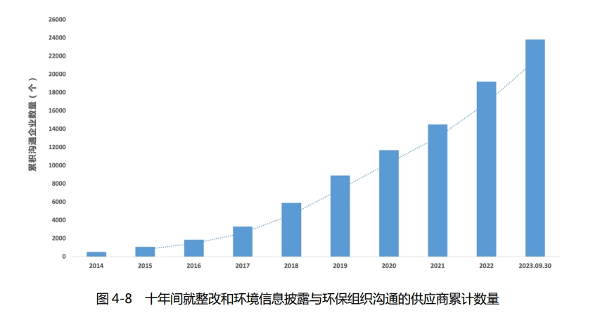 CITI指数报告显示:十年间,越来越多的采购企业基于自身的绿色供应链管理要求,推动供应商向社会公开披露违规问题改善情况与环境合规信息。在检索供应商环境合规表现的基础上,推动存在环境违规问题的供应商公开披露情况说明与整改证明资料的采购企业数量从2014年的40家增加至2023年的102家。更多品牌虽未推动公开披露,但也开始借助大数据开展供应链环境管理。在采购企业的引导与推动下,就环境违规问题、整改措施和环境信息披露与环保组织开展沟通交流的供应商从2014年的500余家,跃升至2023年累计超 2.5万家。