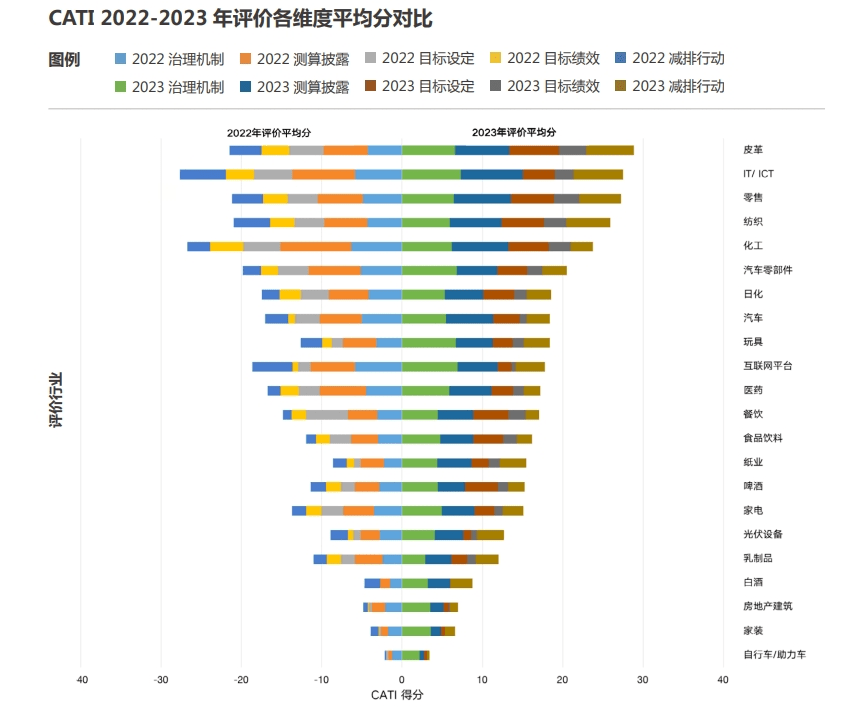 2023年度供应链气候行动CATI指数年度报告,通过分行业对比两年CATI评价各维度的平均分显示,本期评价的 22 个行业中:皮革、纸业、零售、玩具等19个行业CATI总分的平均分得分率相对 2022 年呈上升趋势,同比平均增加 26%;在测算披露维度,零售、化工、皮革行业在本期评价的得分率8位居前三;对比 2022 年,白酒、纸业、光伏设备等11个行业中通过测算披露摸清排放家底的企业数量增加,平均分得分率同比增长 19.5%;在目标设定和目标进展追踪维度,零售、皮革、纺织、化工行业领先于其他行业;啤酒、食品饮料、汽车、光伏设备等17个行业在目标设定维度的平均得分率相对 2022 年同步增加34.4%;餐饮、纺织、纸业11个行业的更多企业追踪并披露所设定目标的完成进展,同比平均增加 24.5%;在减排行动维度,IT/ICT、皮革、纺织、零售等行业在自身运营和引导供应商开展行动并自主开展碳核算方面领跑,仍在持续进步,得分较上一年有所提升。纸业、光伏设备、乳制品、日化等19个行业平均分得分率同比增长 24.5%,行业企业正在逐步落实减排行动。