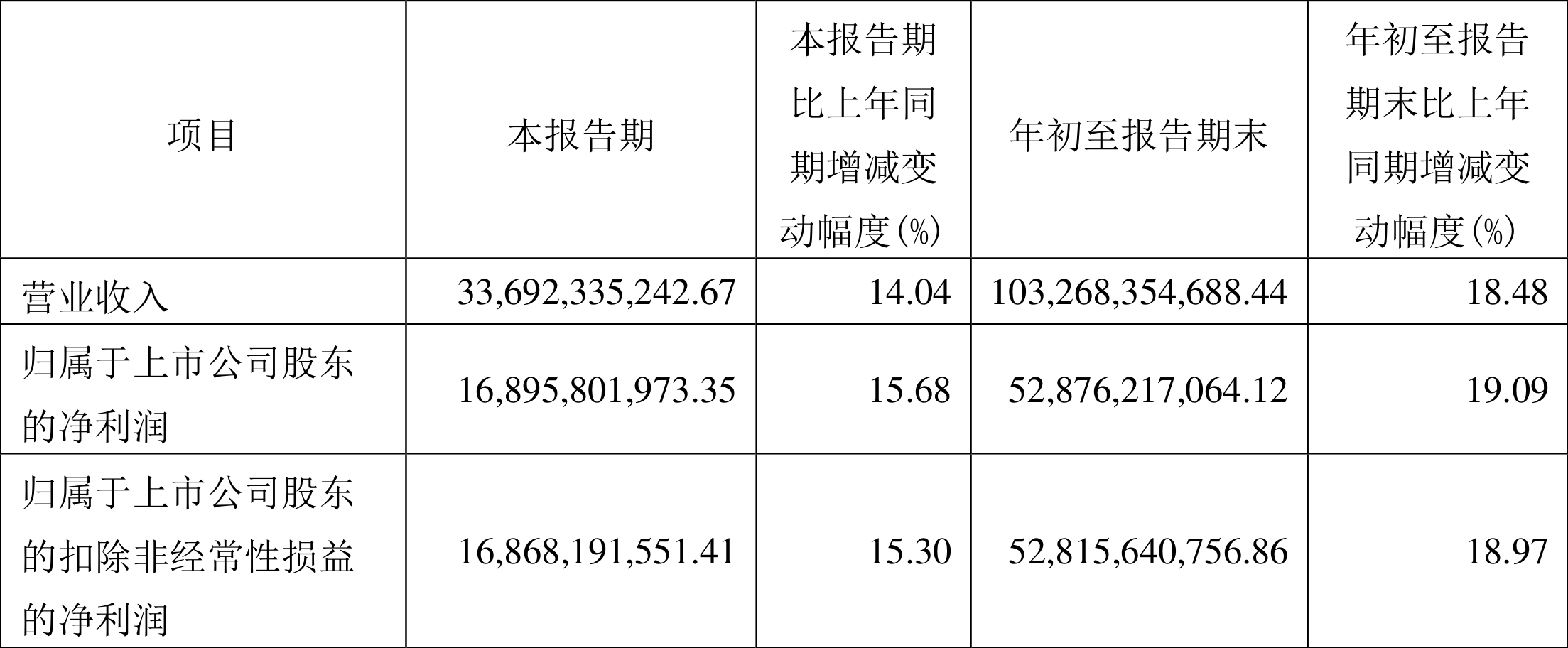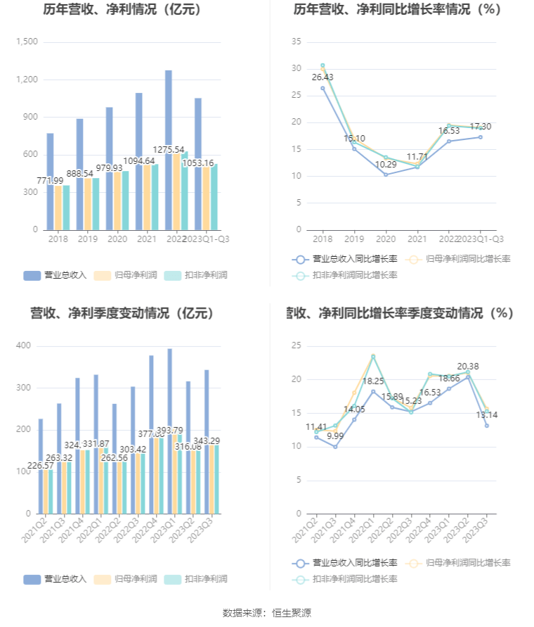 根据三季报,公司第三季度实现营业总收入343.29亿元,同比增长13.14%,环比增长8.61%;归母净利润168.96亿元,同比增长15.68%,环比增长11.26%;扣非净利润168.68亿元,同比增长15.30%,环比增长11.20%。