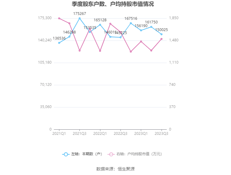 筹码集中度方面,截至2023年三季度末,公司股东总户数为15万户,较上半年末下降了1.17万户,降幅7.25%;户均持股市值由上半年末的1313.28万元上升至1505.97万元,增幅为14.67%。