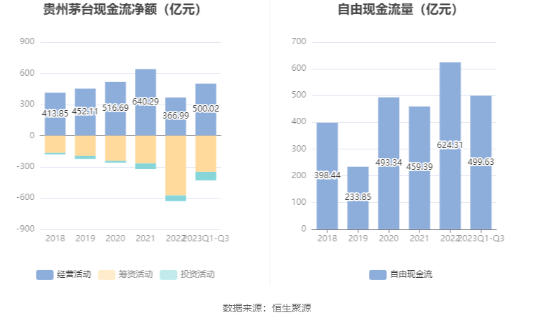 2023年前三季度,公司经营活动现金流净额为500.02亿元,同比增长431.63%,主要系本期公司控股子公司贵州茅台集团财务有限公司存放中央银行和同业款项净增加额减少及销售商品收到的现金增加所致;筹资活动现金流净额-347.25亿元,同比减少48.60亿元;投资活动现金流净额-83.16亿元,上年同期为-26.71亿元。