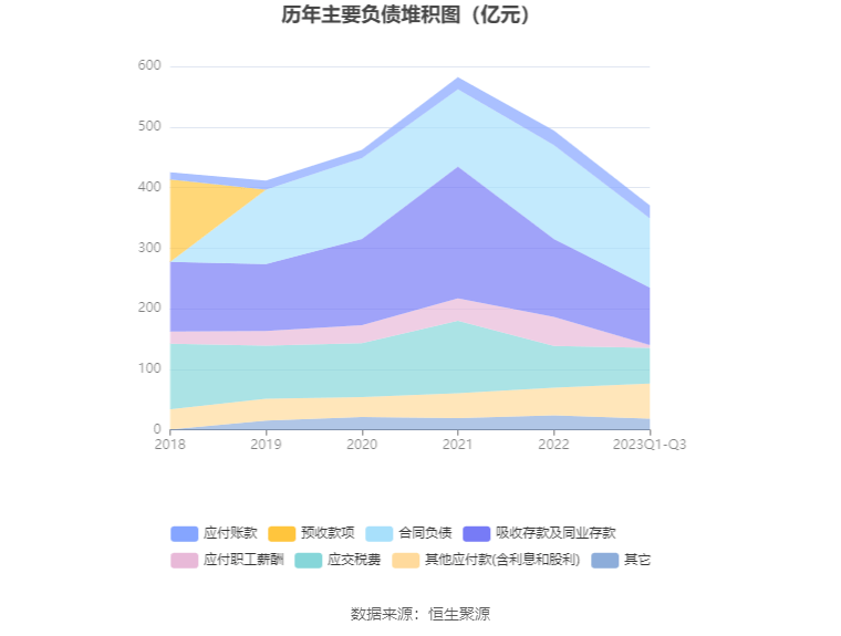 负债重大变化方面,截至2023年三季度末,公司应付职工薪酬较上年末减少91.05%,占公司总资产比重下降1.72个百分点;合同负债较上年末减少26.35%,占公司总资产比重下降1.73个百分点;吸收存款及同业存款较上年末减少26.01%,占公司总资产比重下降1.43个百分点;其他应付款(含利息和股利)较上年末增加26.85%,占公司总资产比重上升0.41个百分点。