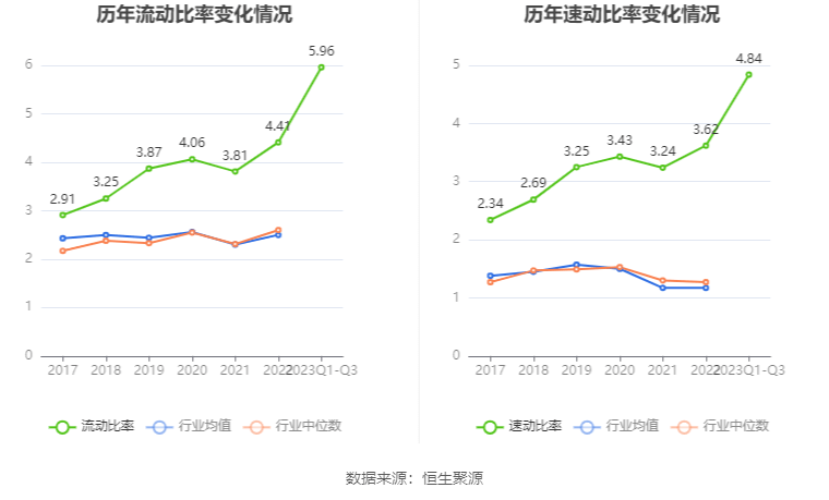 2023年前三季度,公司流动比率为5.96,速动比率为4.84。