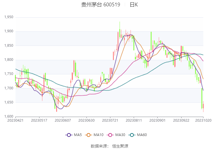 以10月20日收盘价计算,贵州茅台目前市盈率(TTM)约为29.03倍,市净率(LF)约为9.49倍,市销率(TTM)约为14.74倍。