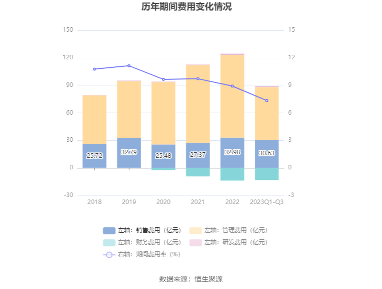 2023年前三季度,公司期间费用为75.65亿元,较上年同期增加4.81亿元;但期间费用率为7.33%,较上年同期下降0.80个百分点。其中,销售费用同比增长27.31%,管理费用同比增长2.96%,研发费用同比下降12.01%,财务费用由去年同期的-10.05亿元变为-13.32亿元。