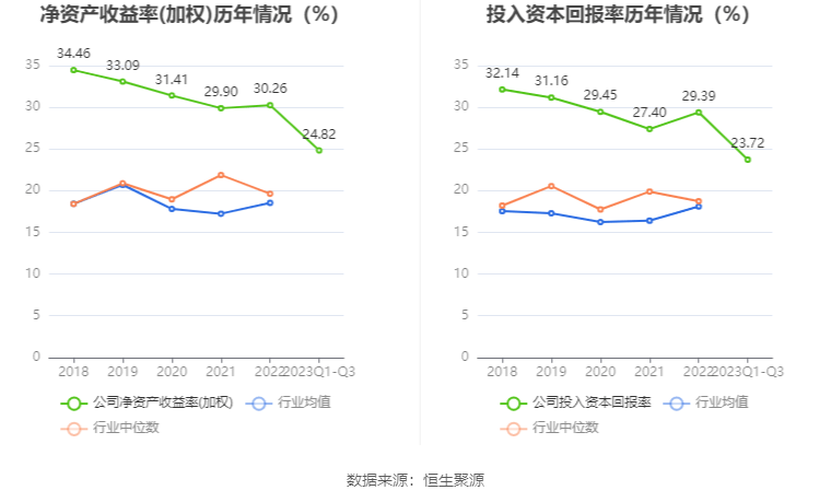 数据显示,2023年前三季度公司加权平均净资产收益率为24.82%,较上年同期增长2.91个百分点;公司2023年前三季度投入资本回报率为23.72%,较上年同期增长3.09个百分点。