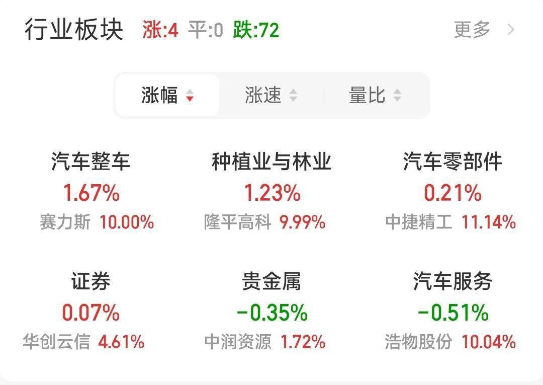 在行业板块中,汽车整车、种植业与林业、汽车零部件、证券四个板块逆势上涨。