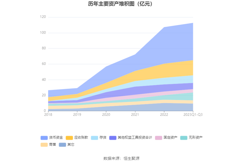 资产重大变化方面,截至2023年三季度末,公司无形资产较上年末增加73.84%,占公司总资产比重上升3.56个百分点;开发支出较上年末减少56.65%,占公司总资产比重下降1.72个百分点;其他权益工具投资合计较上年末减少12.69%,占公司总资产比重下降1.44个百分点;货币资金较上年末增加2.25%,占公司总资产比重下降1.20个百分点。