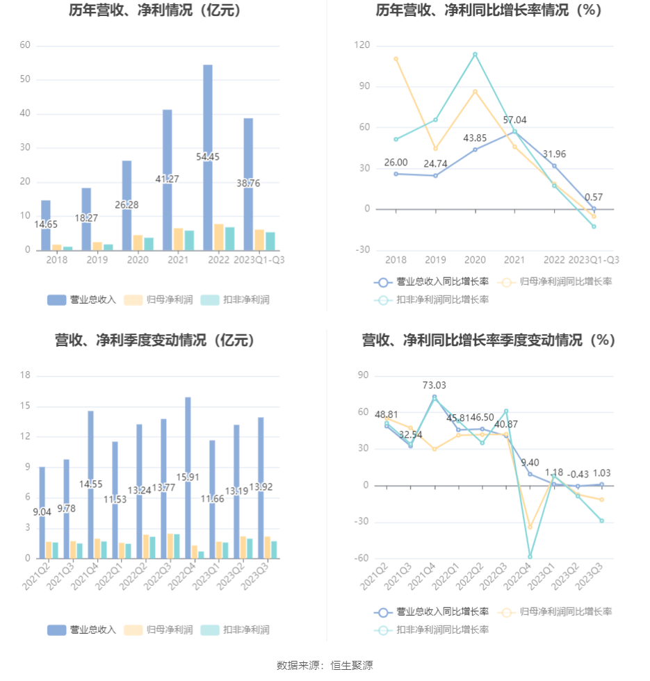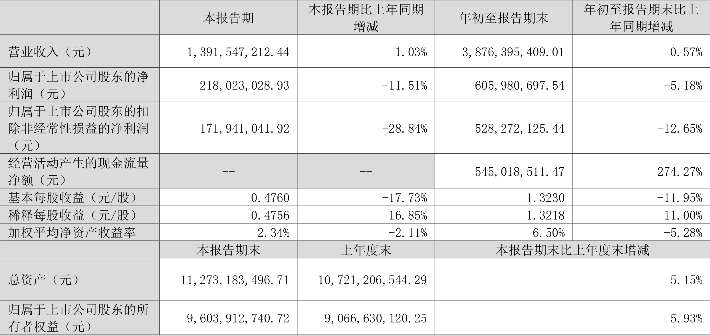 根据三季报,公司第三季度实现营业总收入13.92亿元,同比增长1.03%,环比增长5.53%;归母净利润2.18亿元,同比下降11.51%,环比下降0.71%;扣非净利润1.72亿元,同比下降28.84%,环比下降12.93%。