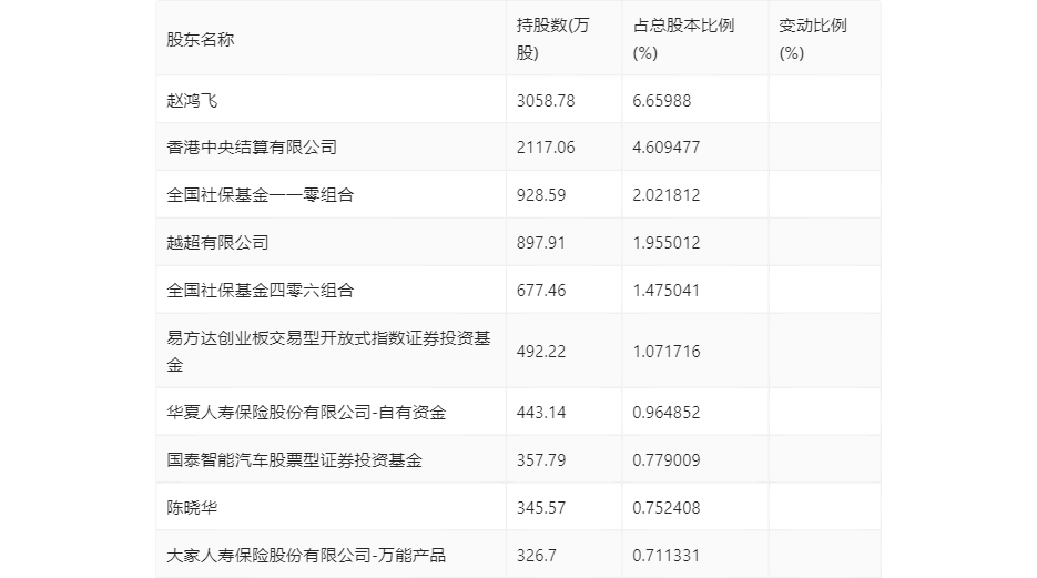 三季报显示,2023年三季度末公司十大流通股东中,新进股东为大家人寿保险股份有限公司-万能产品,取代了上半年末的嘉实新兴产业股票型证券投资基金。在具体持股比例上,易方达创业板交易型开放式指数证券投资基金、华夏人寿保险股份有限公司-自有资金持股有所上升,赵鸿飞、香港中央结算有限公司、全国社保基金一一零组合、越超有限公司、全国社保基金四零六组合、国泰智能汽车股票型证券投资基金、陈晓华持股有所下降。