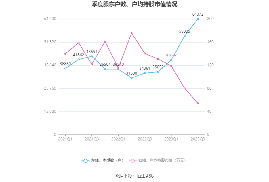 筹码集中度方面,截至2023年三季度末,公司股东总户数为6.44万户,较上半年末增长了9367户,增幅17.03%;户均持股市值由上半年末的80.30万元下降至54.63万元,降幅为31.97%。