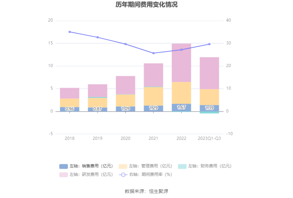 2023年前三季度,公司期间费用为11.49亿元,较上年同期增加1.36亿元;期间费用率为29.64%,较上年同期上升3.37个百分点。其中,销售费用同比增长12.6%,管理费用同比增长0.36%,研发费用同比增长30.5%,财务费用由去年同期的-54.93万元变为-4569.20万元。