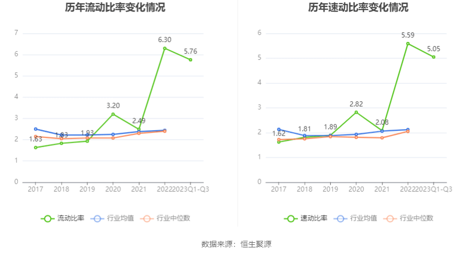 2023年前三季度,公司流动比率为5.76,速动比率为5.05。