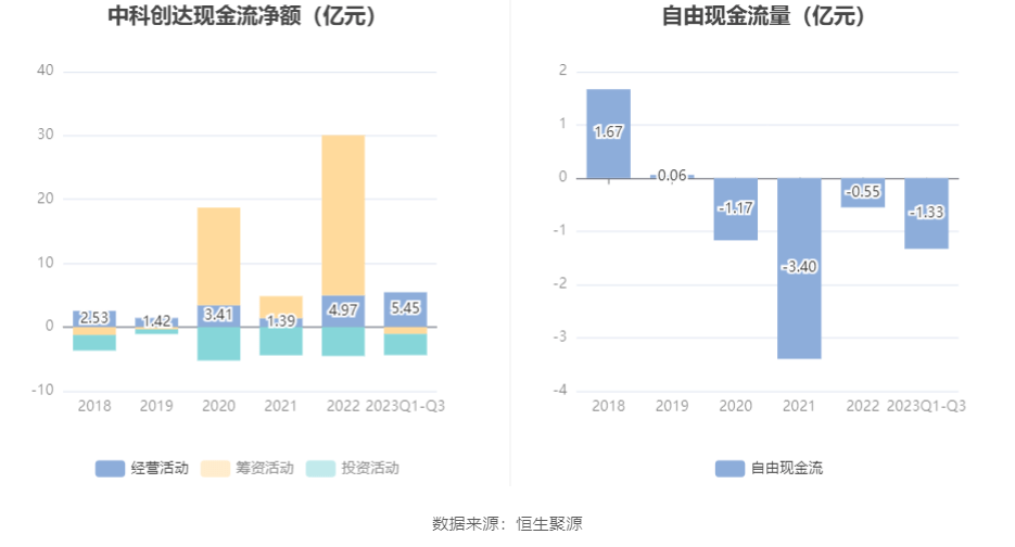 进一步统计发现,2023年前三季度公司自由现金流为-1.33亿元,上年同期为-4.96亿元。