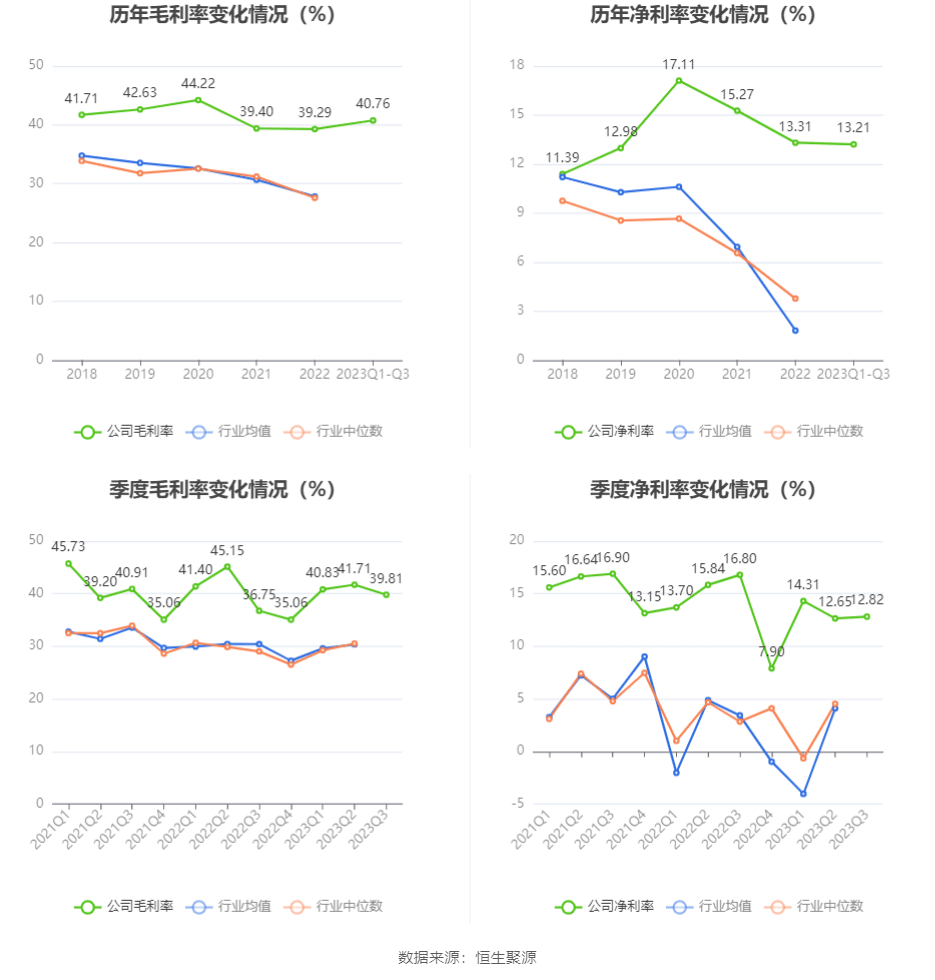 2023年前三季度,公司毛利率为40.76%,同比下降0.27个百分点;净利率为13.21%,较上年同期下降2.34个百分点。从单季度指标来看,2023年第三季度公司毛利率为39.81%,同比上升3.06个百分点,环比下降1.90个百分点;净利率为12.82%,较上年同期下降3.98个百分点,较上一季度上升0.17个百分点。