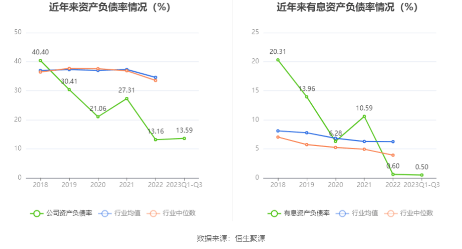 在偿债能力方面,公司2023年三季度末资产负债率为13.59%,相比上年末上升0.43个百分点;有息资产负债率为0.50%,相比上年末下降0.10个百分点。
