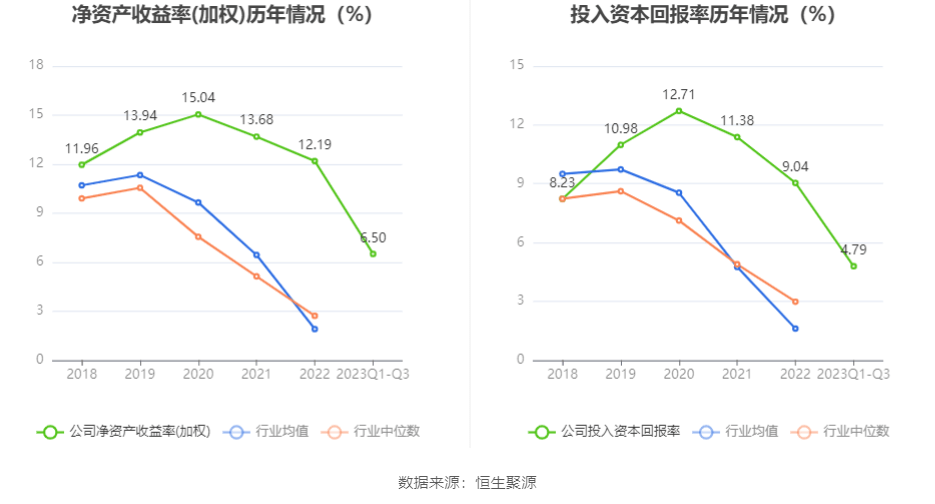 数据显示,2023年前三季度公司加权平均净资产收益率为6.50%,较上年同期下降5.28个百分点;公司2023年前三季度投入资本回报率为4.79%,较上年同期下降2.70个百分点。