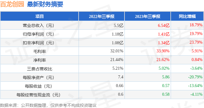 据证券之星公开数据整理,近期百龙创园(605016)发布2023年三季报。根据财报显示,本报告期中百龙创园营收净利润双双增长。截至本报告期末,公司营业总收入6.54亿元,同比上升18.79%,归母净利润1.41亿元,同比上升19.79%。按单季度数据看,第三季度营业总收入2.41亿元,同比上升52.74%,第三季度归母净利润5023.99万元,同比上升27.07%。