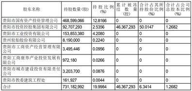 本次被司法冻结的股份为贵阳投资控股持有公司的46,367,293股, 占其持有公司股份数的50.0147%,占公司总股本1.2682%;贵阳投资控股与其一致行动人合计被冻结股份46,367,293股,占其合计持有公司股份数的6.3414%,占公司总股本1.2682%。
