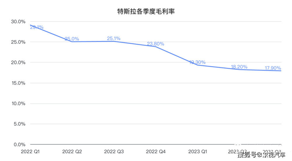 更为严重的是,大幅降价、销量下滑的后遗症终于爆发,带来了恶劣的连锁反应,导致特斯拉毛利率持续走低。要知道今年一季度,特斯拉毛利率还高达29.1%,三季度则大幅降至17.90%,这已经是特斯拉连续三个季度低于20%了,已经“泯然众人矣”。毛利率、净利润的接连下滑表明,降价带来的销量增长并不可持续,反而会影响公司财务表现。如果神话破灭,品牌光环丧失,只能以价换量,这样的特斯拉注定走不远。