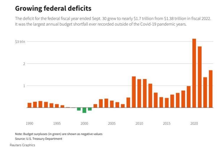 由于与2022财年相比收入的降幅远超支出的降幅,美国联邦政府的财政预算赤字扩大至1.7万亿美元,为有纪录以来最三大缺口,相当于美国该财年国内生产总值GDP的6.3%。