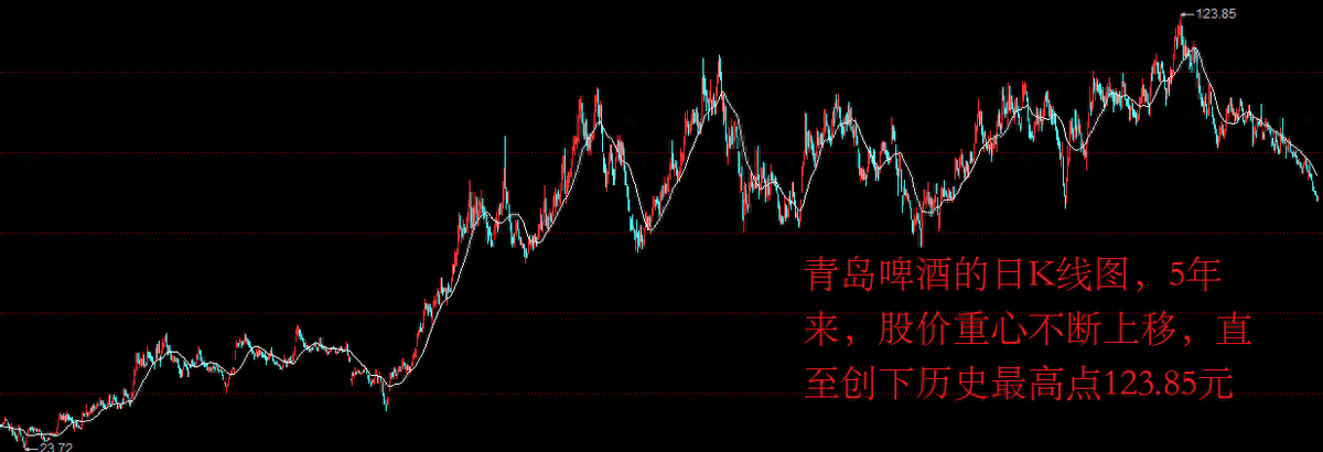 5年来,以前复权价格显示,青岛啤酒的股价重心不断上移,直至创下了历史最高点123.85元。而起涨点仅为23.72元,5年还不到的时间变了5倍。