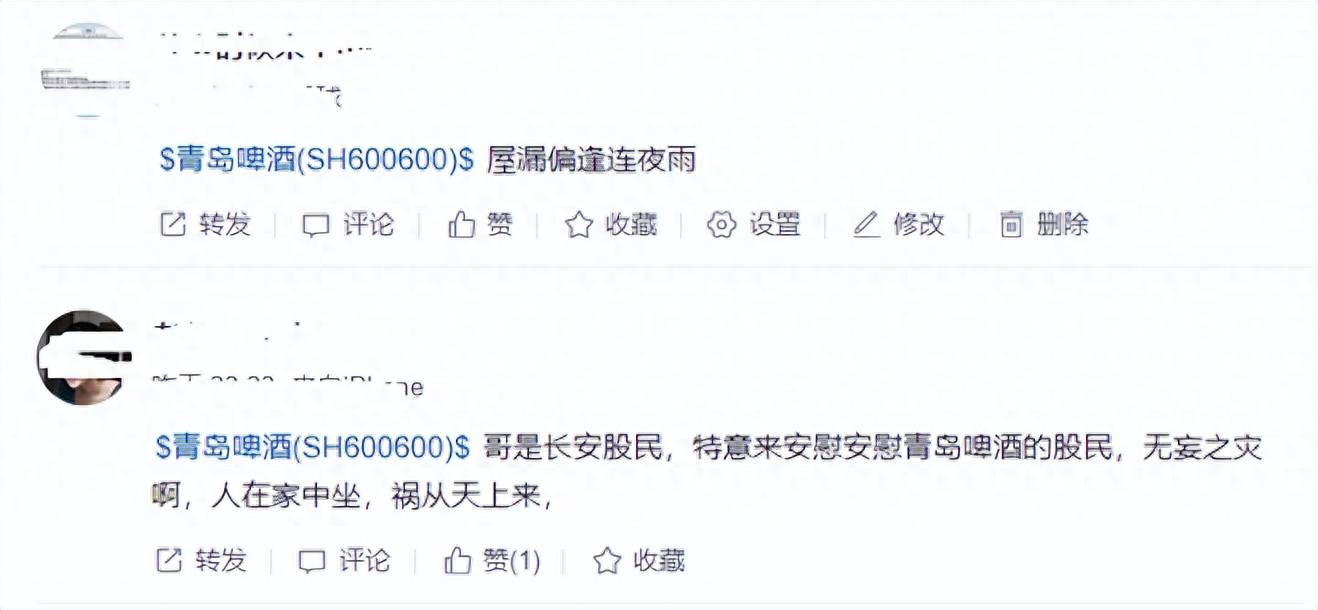 还有“吃瓜”的投资者表示道:“长安(汽车)股民特意来安慰安慰青岛啤酒的股民,无妄之灾,人在家中坐,祸从天上来”。