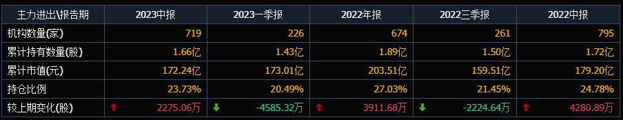 在个股的交易层面上,青岛啤酒的主力持仓数据中显示,2023中报的机构家数为719家,较2022年报的674家增加了45家,是为数不多机构数量增加的品牌股。