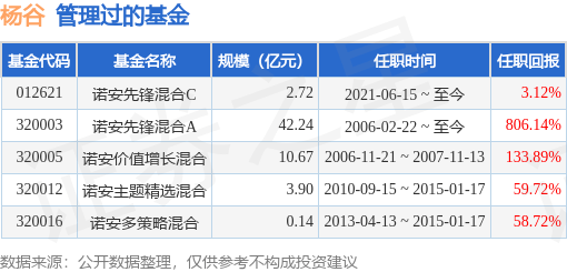 杨谷先生:经济学硕士,CFA,具有基金从业资格。曾任职于平安证券公司综合研究所、西北证券公司资产管理部;2003年10月加入诺安基金管理有限公司,现任公司副总经理、投资总监。曾于2006年11月至2007年11月任诺安价值增长股票证券投资基金基金经理,2006年2月起任诺安股票证券投资基金基金经理,2010年9月起任诺安主题精选股票型证券投资基金基金经理。