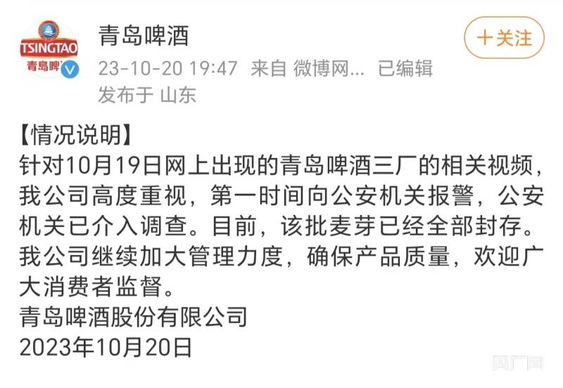 央广网济南10月21日消息(记者程立龙)10月20日,青岛啤酒发布声明回应称,针对10月19日网上出现的青岛啤酒三厂的相关视频,公司高度重视,第一时间向公安机关报警,公安机关已介入调查。目前,该批麦芽已经全部封存。公司继续加大管理力度,确保产品质量,欢迎广大消费者监督。